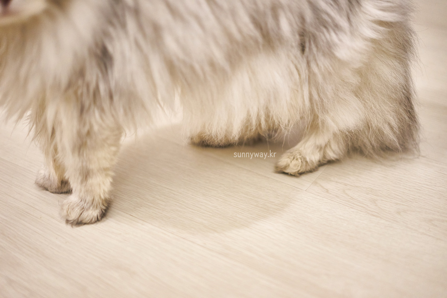 다만 뒷다리에 힘이 없어 보이는 건 분명하다. 걸을 때는 뒷다리 발끝으로 걷는데 네 발로 서 있을 때는 발끝으로 꼿꼿하게 서 있지 못한다. 그리고 꼬리가 항상 내려와 있다. 기분 좋으면 막 올린채 다니고 자유자재로 움직이던 꼬리를 바닥에 닿은 채 걷는다.