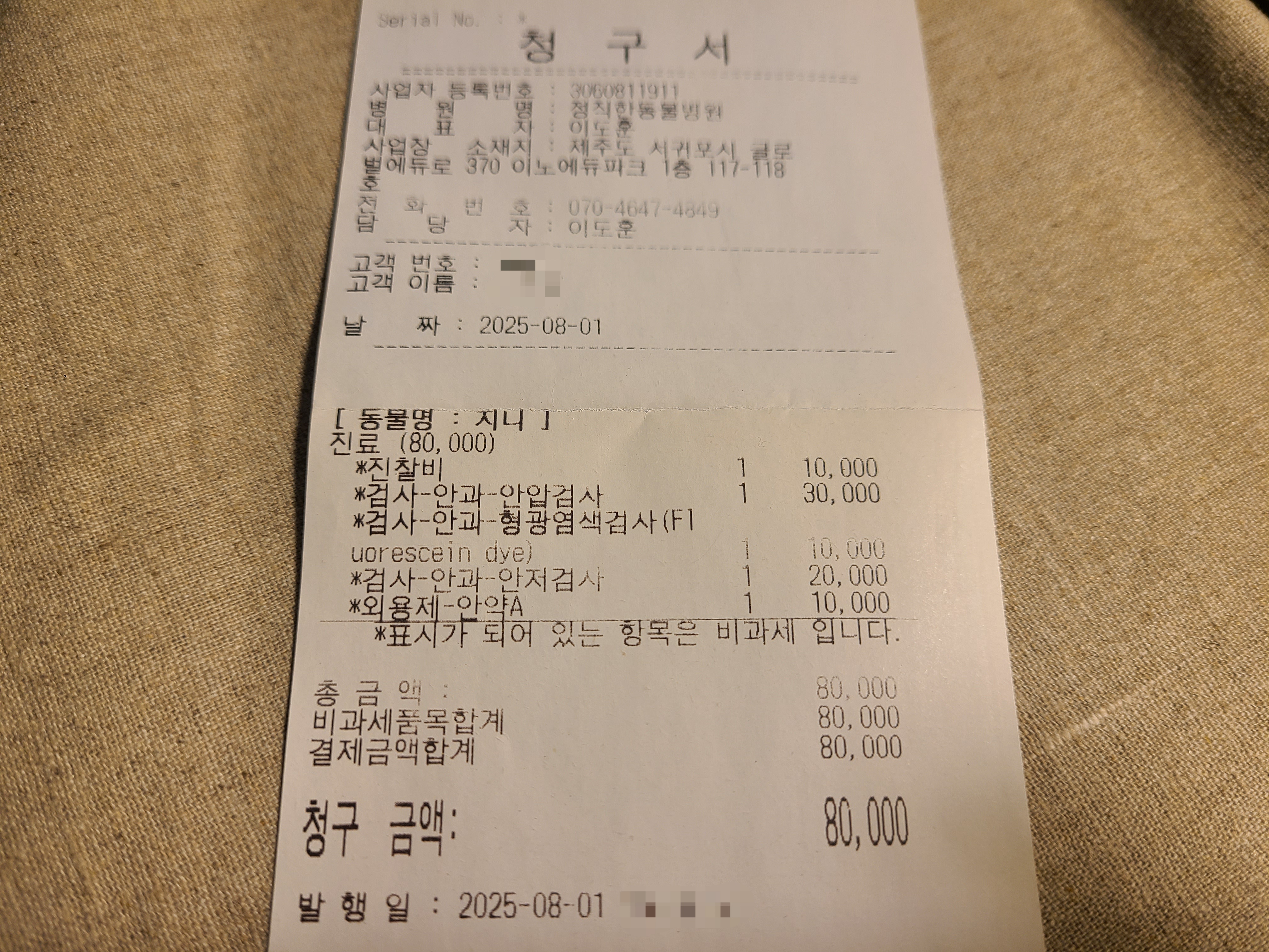2025년 7월 31일, 22살이 되고 3개월이 다 되어 가던 무렵, 오른쪽 눈동자가 갑자기 이상해졌다. 안구의 일부에 옅은 갈색이 베어져 있고 탁해져 있었다. 다음 날 병원을 찾았다. 늘 가던 한수풀동물병원은 때마침 임시휴무일이라 갈 수 없었다. 가장 가까운 동물병원은 영어교육도시에 있었다. 팔뚝에 긁힌 자국이 몇 개나 있던 젊은 남자선생님께서 조심스럽게 지니의 눈을 살펴보았다. 정확한 진단을 위해 몇 가지 검사를 하기로 했다. 초조한 마음으로 대기실에서 검사가 끝나기를 기다렸다. 나이가 나이인 만큼 문제가 있어도 이상하지 않을 일이었지만 별일 아니길 간절히 바랐다.